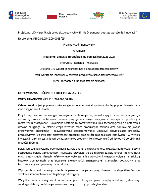 W październiku 2022 roku fima Drewnopol Piotr Rećko została włączona do spółki Drewnopol Piotr i Jacek Rećko spółka komandytowa. Od tego momentu działamy pod nową nazwą. Pozostałe dane kontaktowe się nie zmieniły.